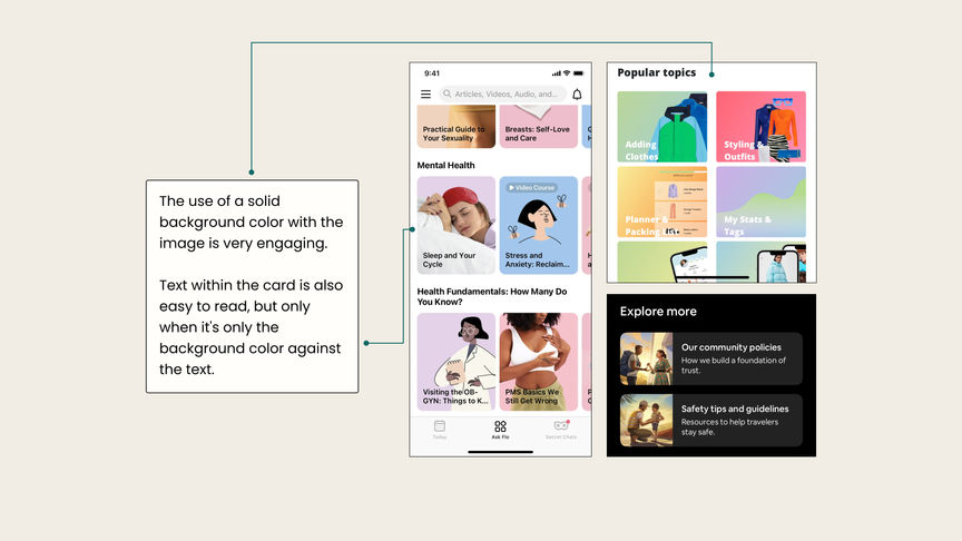 Elder users desire simple and minimal layouts for best user experience. Copy and tone are critical to ensure elder users feel heard and understood, but they do not want to feel patronized in their lack of understanding. Balance encouragement and maturity with intention.